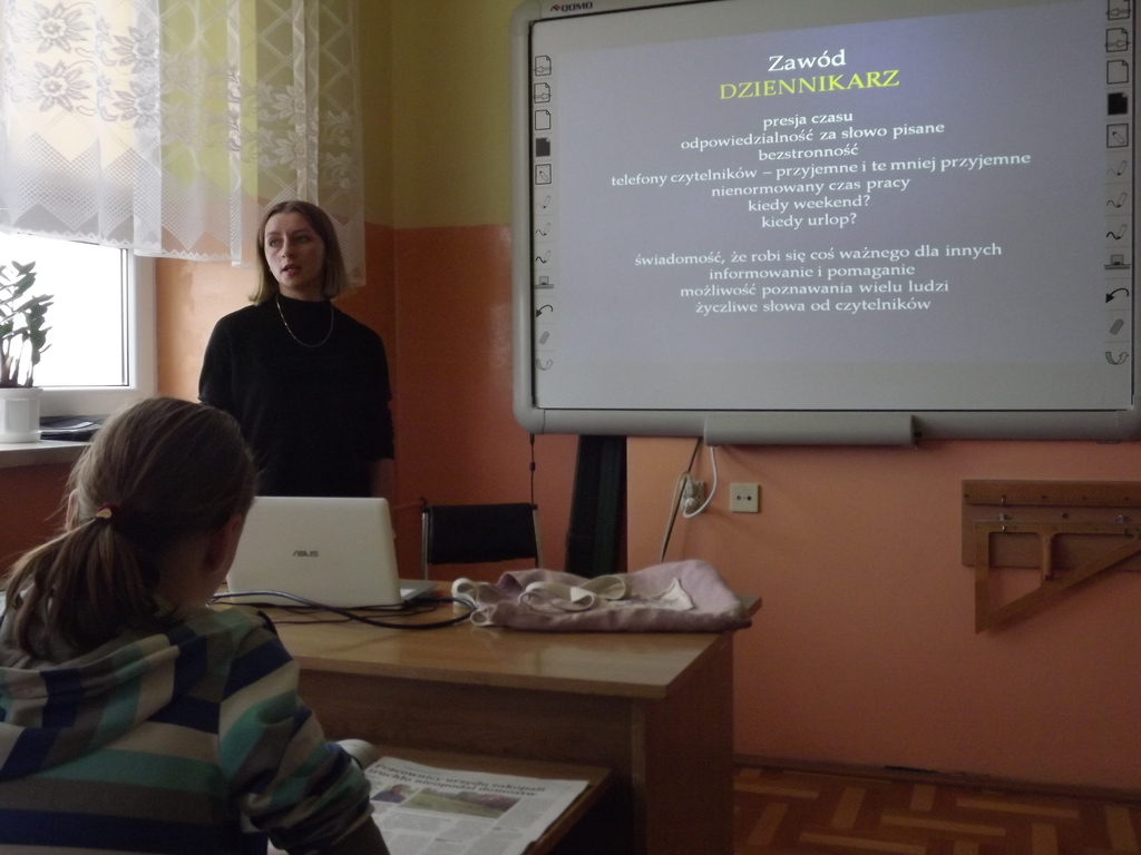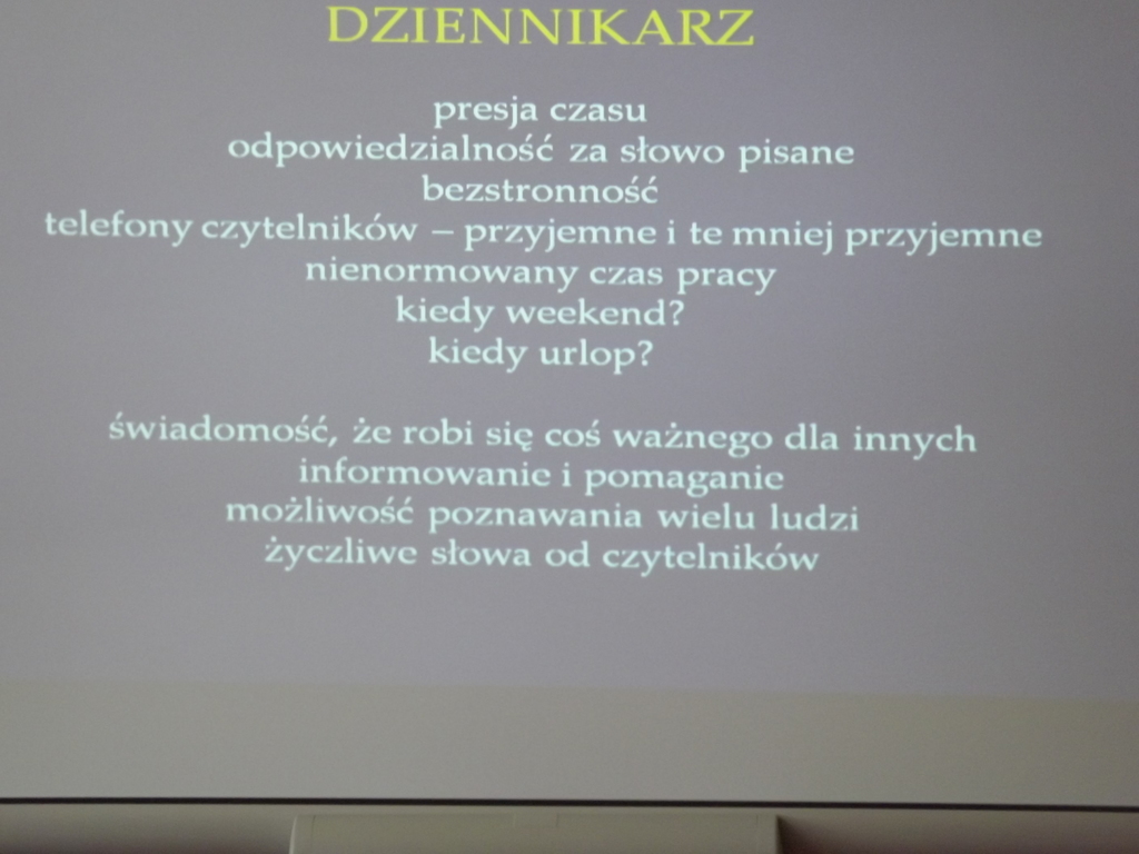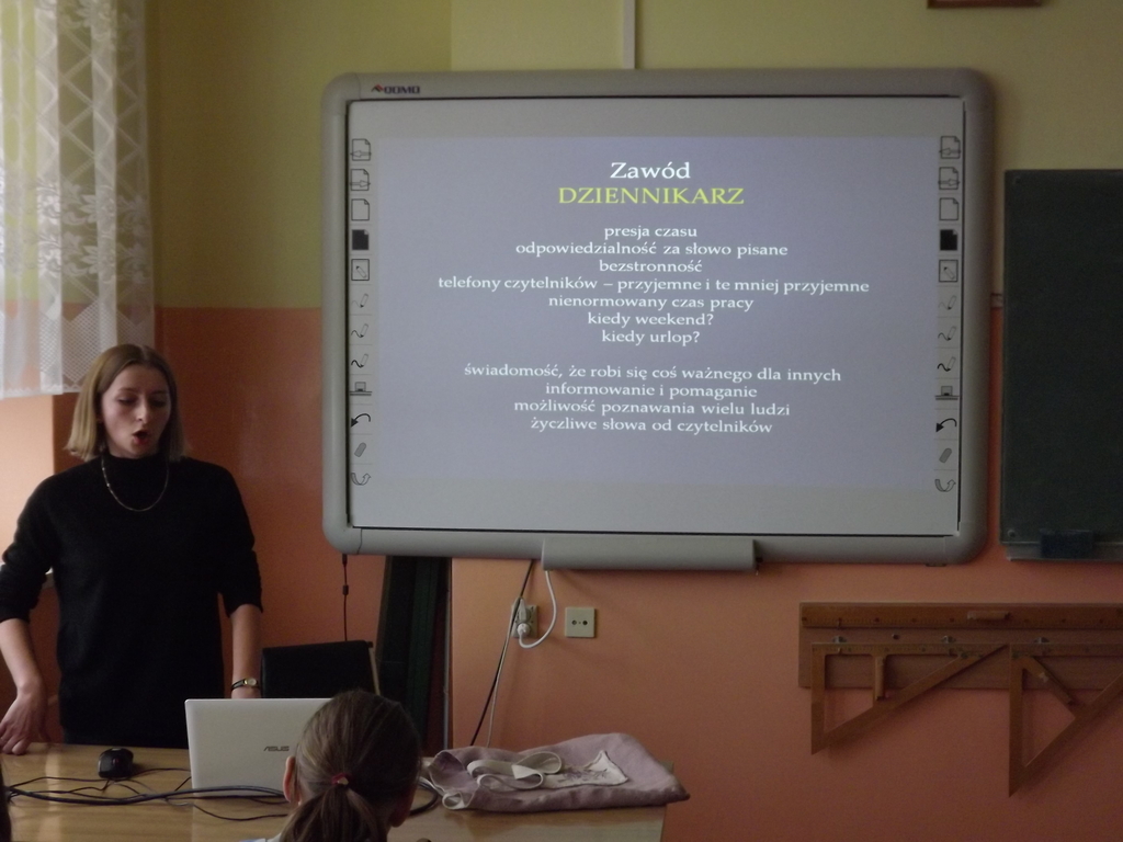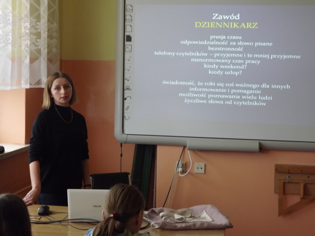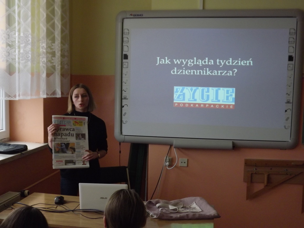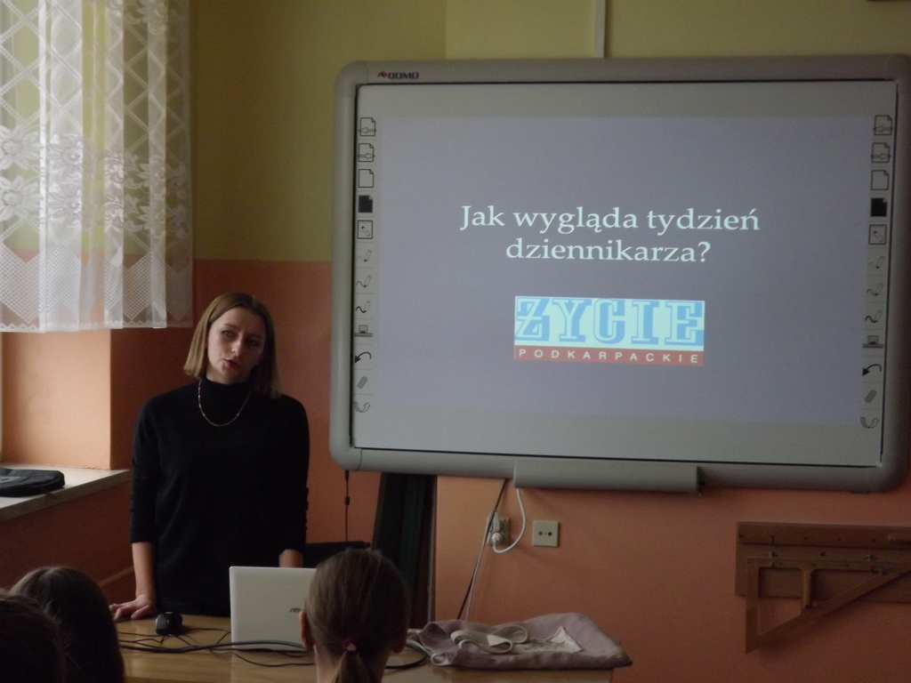 W środę 16 listopada w Zespole Szkół odbyło się spotkanie z panią Barbarą Chmurą-dziennikarką „Życia Podkarpackiego”. Uczniowie klas gimnazjalnych oraz kl. szóstej uzyskali wiele interesujących informacji na temat pracy dziennikarza oraz sposobu przygotowania artykułów prasowych. Słuchacze dowiedzieli się jak wygląda tydzień dziennikarza, poznali proces powstawania gazety, zapoznali się z podziałem mediów i prasy. Usłyszeli również o tym, jakie są kryteria wartości informacji oraz na jakie pytania ona odpowiada. Pani  dziennikarka w sposób łatwy i przystępny przybliżyła młodzieży zawód, który wymaga dyspozycyjności, bezstronności i odpowiedzialności za słowo, a jednocześnie daje możliwość informowania i pomagania. Ponadto umożliwia poznawanie wielu nowych ludzi, co jest bardzo ważne w profesji dziennikarskiej. Mamy nadzieję, że to spotkanie znacznie ubogaciło wiedzę dotyczącą  zawodu dziennikarza. A może niektórzy zainspirowani wizytą pani redaktor pójdą w przyszłości w jej ślady?.                                                                                                          Bernardetta Wollek