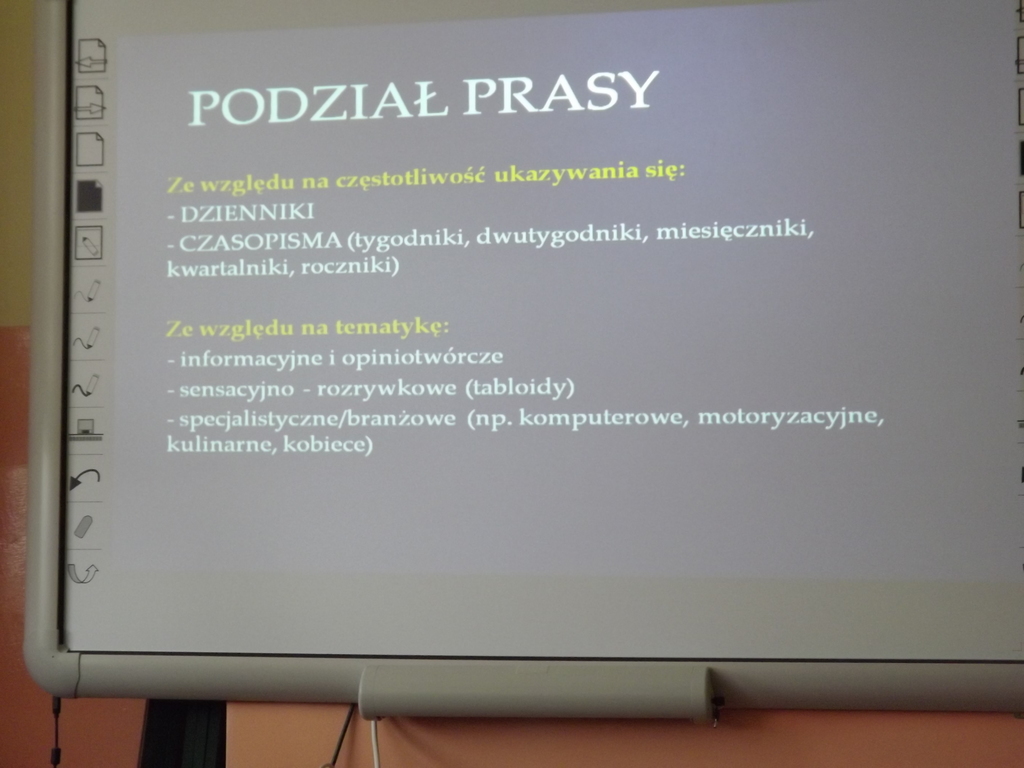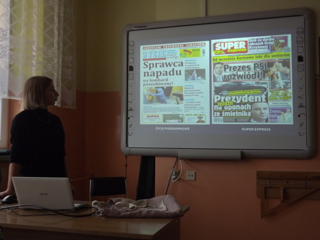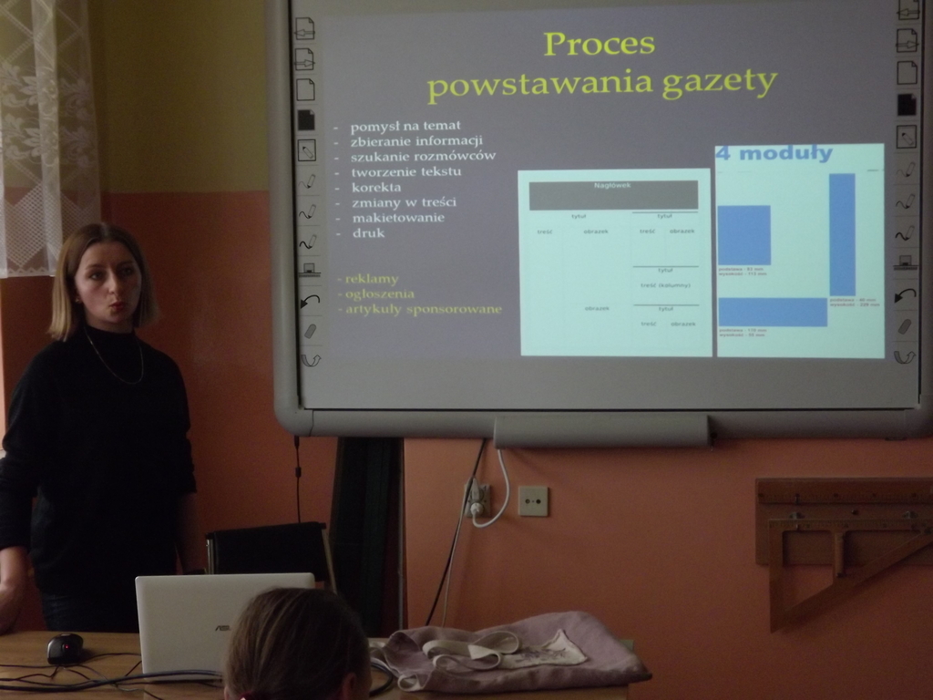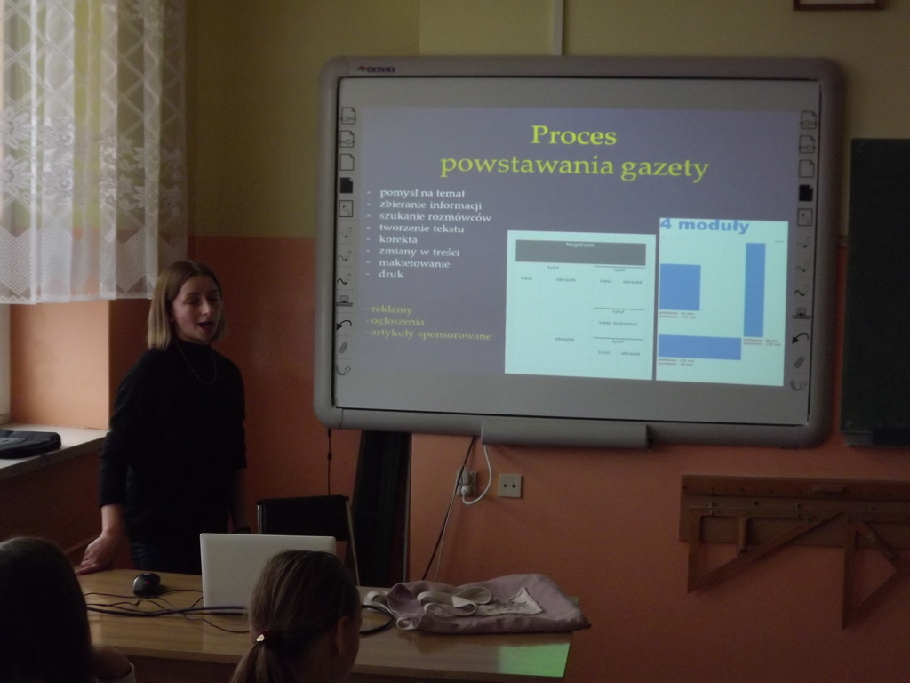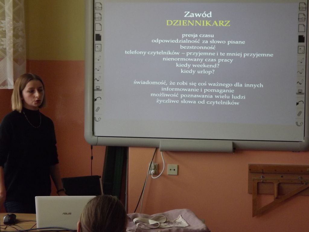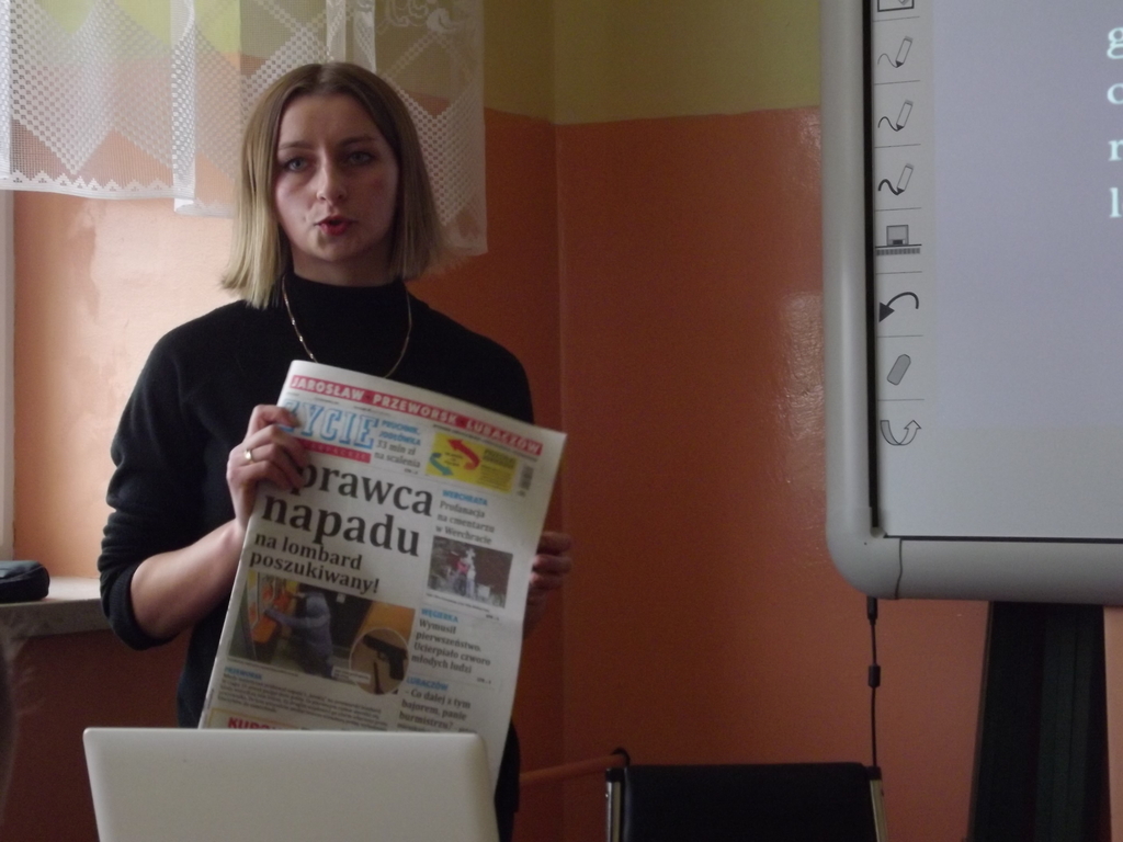 W środę 16 listopada w Zespole Szkół odbyło się spotkanie z panią Barbarą Chmurą-dziennikarką „Życia Podkarpackiego”. Uczniowie klas gimnazjalnych oraz kl. szóstej uzyskali wiele interesujących informacji na temat pracy dziennikarza oraz sposobu przygotowania artykułów prasowych. Słuchacze dowiedzieli się jak wygląda tydzień dziennikarza, poznali proces powstawania gazety, zapoznali się z podziałem mediów i prasy. Usłyszeli również o tym, jakie są kryteria wartości informacji oraz na jakie pytania ona odpowiada. Pani  dziennikarka w sposób łatwy i przystępny przybliżyła młodzieży zawód, który wymaga dyspozycyjności, bezstronności i odpowiedzialności za słowo, a jednocześnie daje możliwość informowania i pomagania. Ponadto umożliwia poznawanie wielu nowych ludzi, co jest bardzo ważne w profesji dziennikarskiej. Mamy nadzieję, że to spotkanie znacznie ubogaciło wiedzę dotyczącą  zawodu dziennikarza. A może niektórzy zainspirowani wizytą pani redaktor pójdą w przyszłości w jej ślady?.                                                                                                          Bernardetta Wollek
