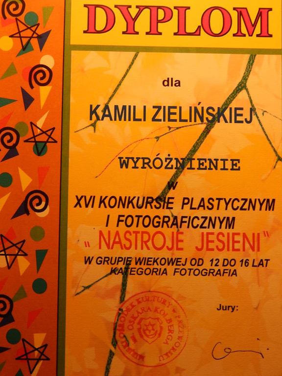 Uczennica I klasy gimnazjum Kamila Zielińska zdobyła II miejsce oraz wyróżnienie w XVI KONKURSIE PLASTYCZNYM I FOTOGRAFICZNYM "Nastroje Jesieni" organizowanym przez MOK w Przeworsku. Do konkursu nadesłano prawie 700 prac. Poziom prac był bardzo wysoki. Gratulujemy Kamili i życzymy dalszych sukcesów w rozwijaniu swojej pasji.